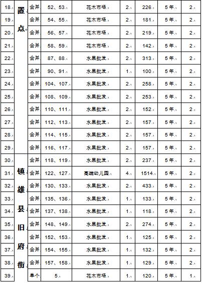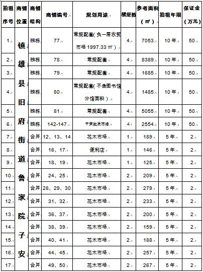 經(jīng)鎮(zhèn)雄縣人民政府批準(zhǔn),受鎮(zhèn)雄縣發(fā)展和改革局委托,公開(kāi)拍租位于縣城南部新區(qū)舊府街道舊府村魯家院子安置點(diǎn)93間商鋪使用權(quán)。相關(guān)事項(xiàng)如下: